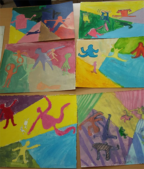 Mélange de dessin et peinture, dessin à vue, personnages,